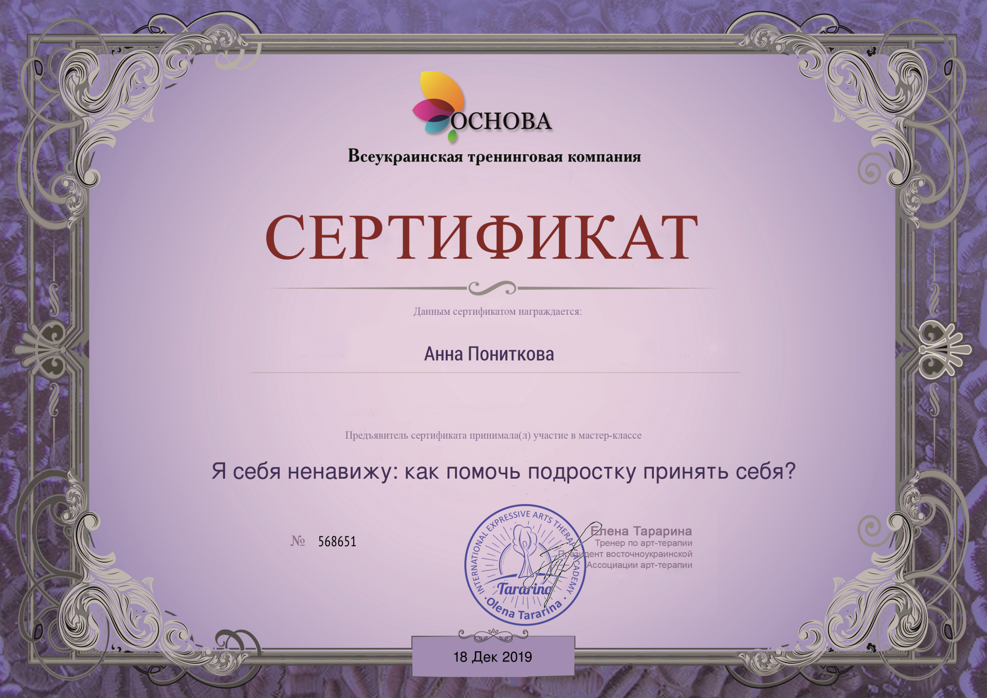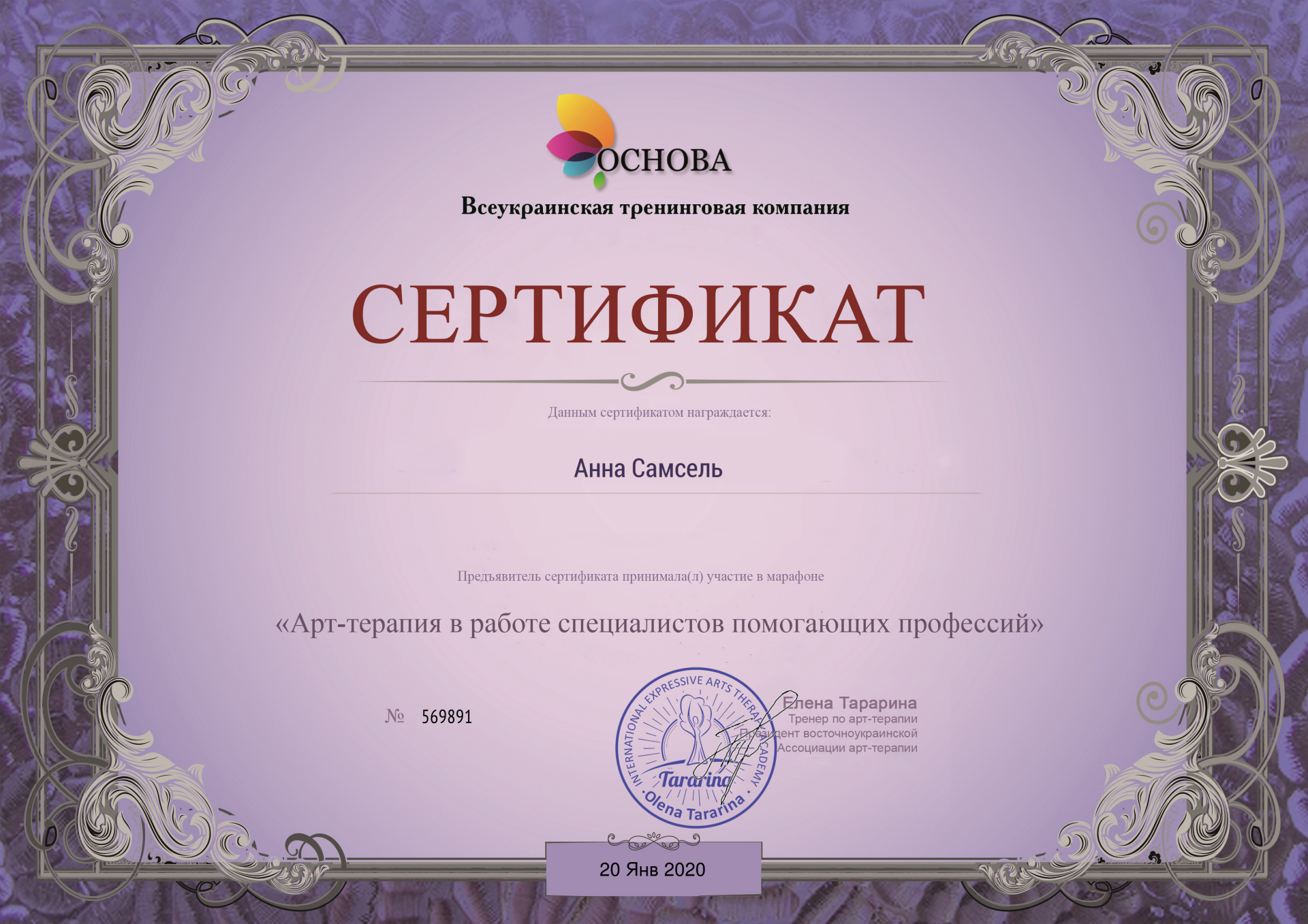 - Международная тренинговая компания «Основа», участник марафона «Арт-терапия в работе специалистов помогающих профессий», 2020 г.