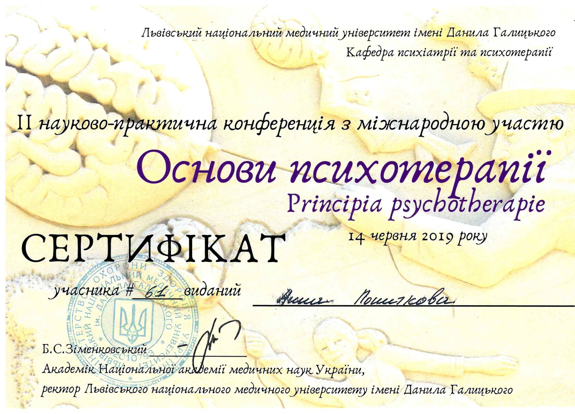 - II научно-практическая конференция с международным участием «Основы психотерапии», г. Львов, 2019 г.