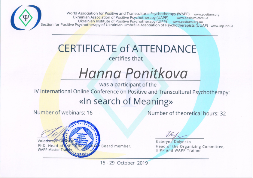 - Украинский институт позитивной кросс-культурной психотерапии, г. Львов, специализация